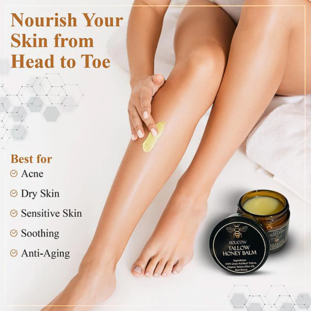Lightweight Hydration for Radiant Skin: Revitalize your skin with our feather-light balm, enriched with organic grass-fed beef tallow and raw honey. Formulated to absorb quickly without clogging pores, it deeply nourishes, locks in moisture, and leaves skin silky-smooth. Infused with olive oil and essential oils, this breathable balm suits all skin types, delivering lasting comfort and a healthy glow.