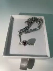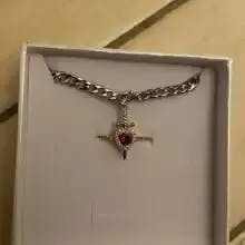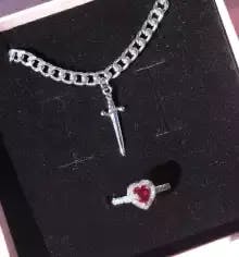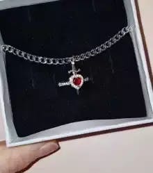 - For Him: A bold Cuban chain bracelet with a sword charm that interlocks with the heart on her ring, symbolizing strength, unity, and love. The sword's placement at the top of the heart represents the inseparable nature of your connection.